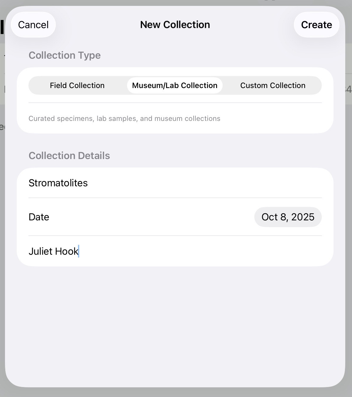 Make sure the window pop-up has the Museum/Lab Collection banner highlighted and fill in the collection details including, name of the collection, date, and the name of the collector. |