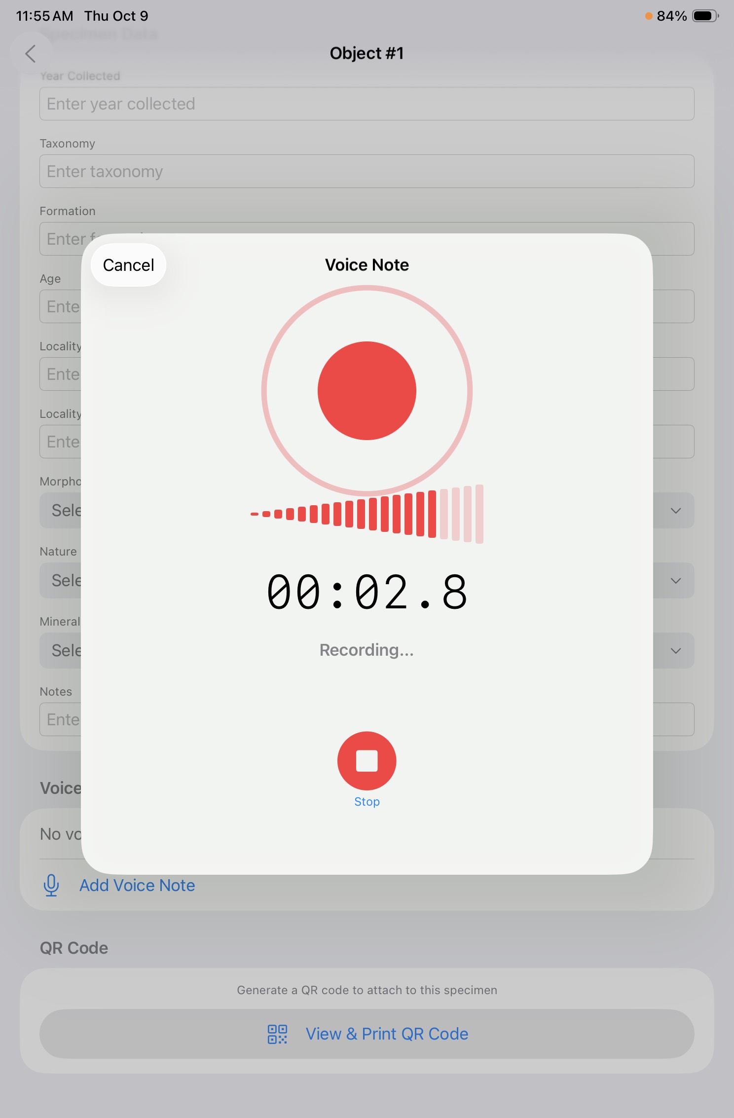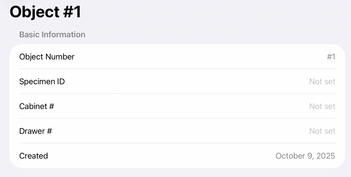 The object number is generated by the app. To add the Specimen ID, locate the number assigned to the specimen, typically written directly on it. For example, a series like “5 of 3/8/85”. |