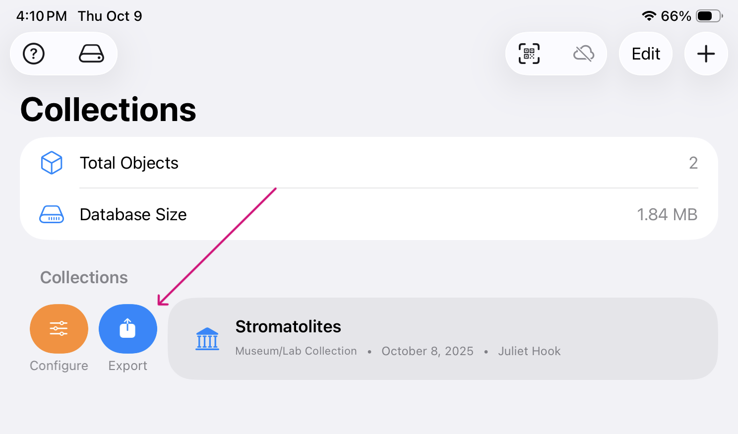 In the home page for the app, swipe the Collection to the right to find the blue export button.  |