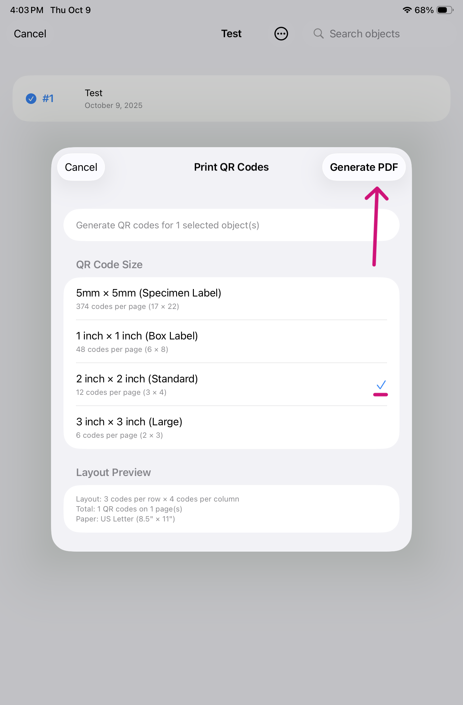 Then, click the circled three dots in the top right-hand corner and select “Print QR Codes.” There are four QR size options to choose from: 5mm x 5mm (Specimen Label); 1 inch x 1 inch (Box Label); 2 inch x 2 inch (Standard) and 3 inch x 3 inch (Large). Lastly, click Generate PDF in the right-hand corner of the pop-up. |