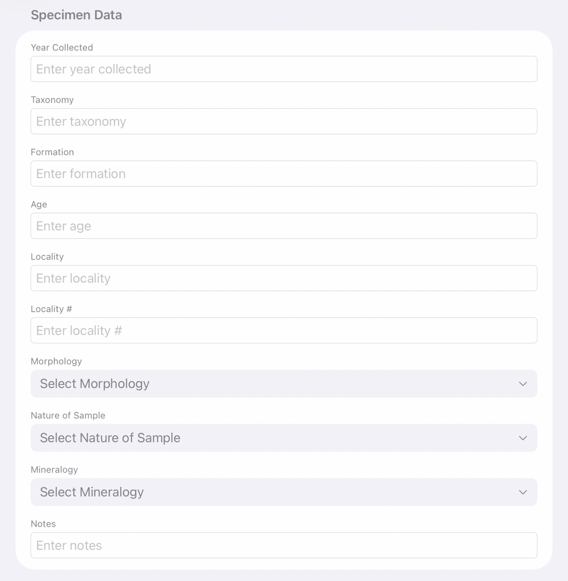 All fields are optional, but it’s best to provide as much information as possible for each specimen at the time of initial entry. Be consistent in how you enter data. For example, if you use the abbreviation “AZ” for Arizona, continue using that format throughout.
