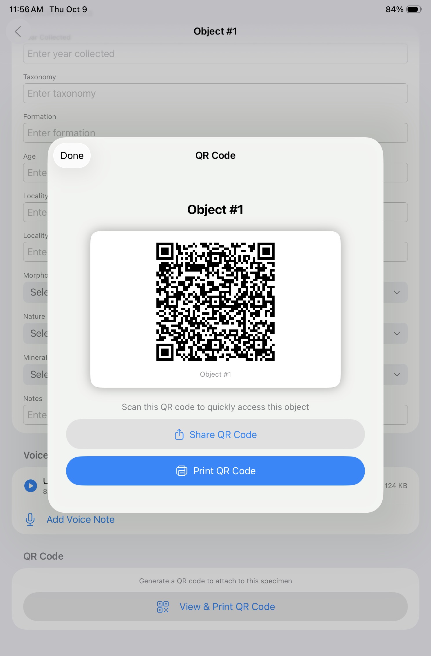 Each specimen entry receives a system generated QR code. Individual QR codes can be viewed and printed within the specimen record however the default size of the QR code will take up the full page.